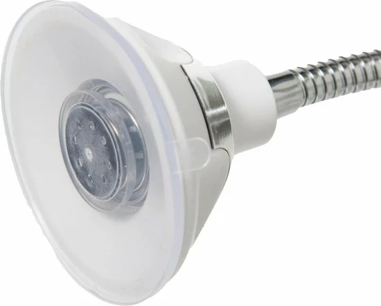 Make-up spiegel met LED verlichting op zuignap 15 cm. De spiegel is draaibaar vergroot 5x. Materiaal: kunststof/metaal. Werkt op 3x AAA batterijen, welke niet zijn inbegrepen. Badkamer scheerspiegels rond.