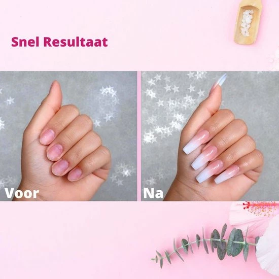 Doordat de nagels met Acryl worden bevochtigd zorgt dit ervoor dat de nagels minder kwetsbaar zullen zijn. Voor acryl is ook geen nagel lamp nodig hierdoor bespaart u tijd in het proces van het zetten van de nagels en zijn de nagels snel droog en hard.