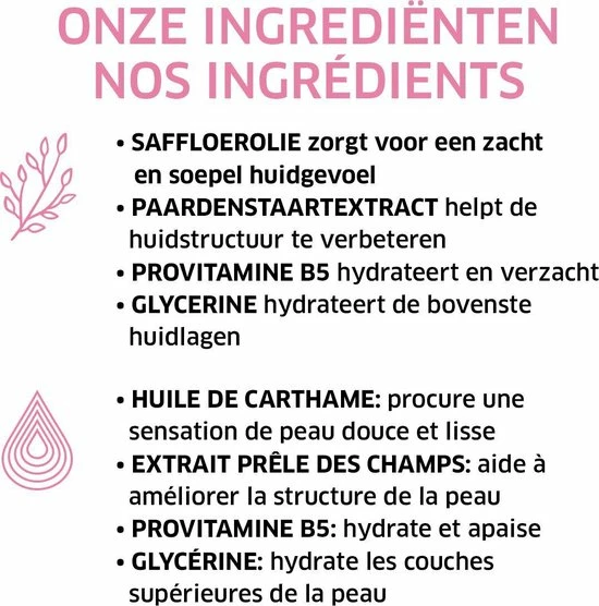 | Ingrediënten | Aqua, (Water, Eau), Ethylhexyl, Palmitate, Hexanediol, Glycerin, Caprylic/Capric, Triglyceride, Behenyl, Alcohol, Carthamus, Tinctorius, (Safflower), Seed, Oil, Sorbitol, Talc, Taurine, Panthenol, Allantoin, Tocopherol, Equisetum, Arvense, Extract, Potassium, Cetyl, Phosphate, Carbomer, Hydroxyacetophenone, Hydrogenated, Palm, Glycerides, Ethylhexylglycerin, Sodium, Hydroxide, Hydrogenated, Palm, Glycerides, Citrate, Parfum, (Fragrance), Benzoic, Acid, CI, 77891, (Titanium, Dioxide) |