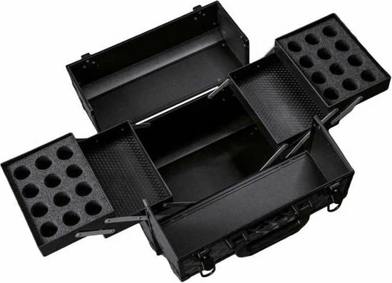 In de stevige, opvouwbare en optimaal bemeten make up koffer Diamond 3D Zwart Maat L kun je eenvoudig een full-size UV- en LED-lamp plaatsen. De make-up koffer Diamond 3D Zwart Maat L gaat aan beide zijden open en heeft 4 verschuifbare planken voor kleine gebruiksvoorwerpen, zoals hybride nagellakken, penselen, kleine en grote cosmetica en een ondervak voor grotere spullen, zoals een ledlamp en een freesmachine. De make up koffer Diamond 3D Zwart maat L is zeer degelijk uitgevoerd met verstevigde hoeken en balken aan de buitenranden om 100% veiligheid te garanderen.