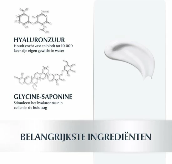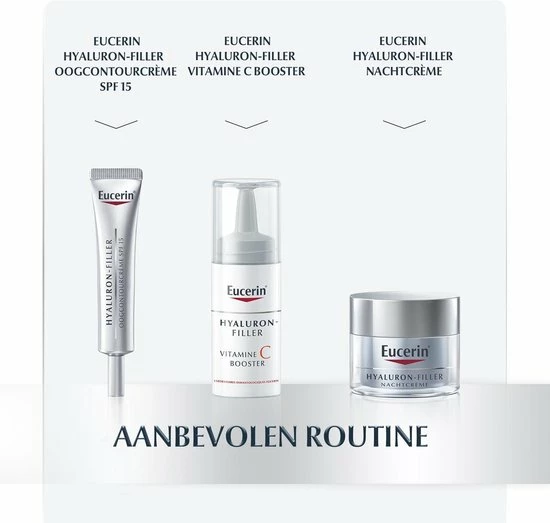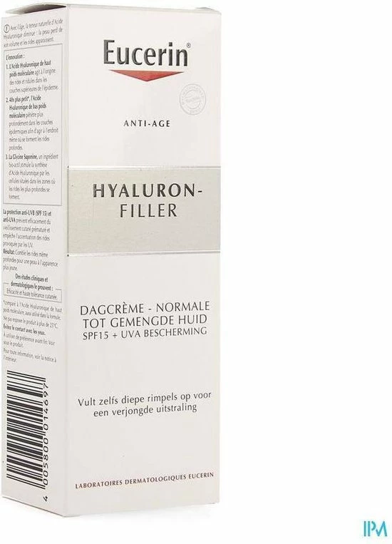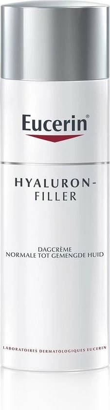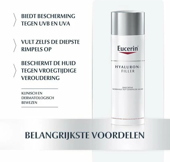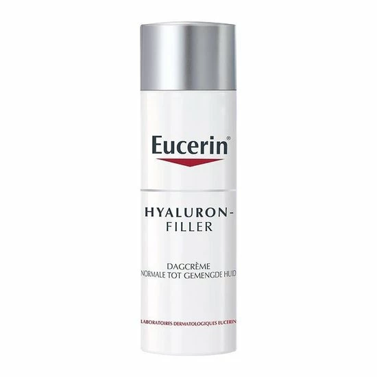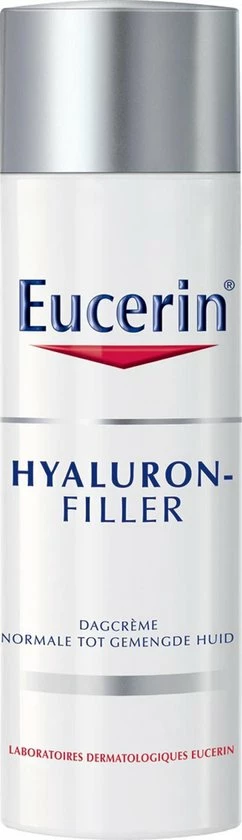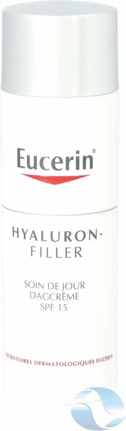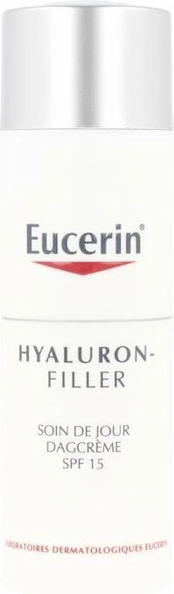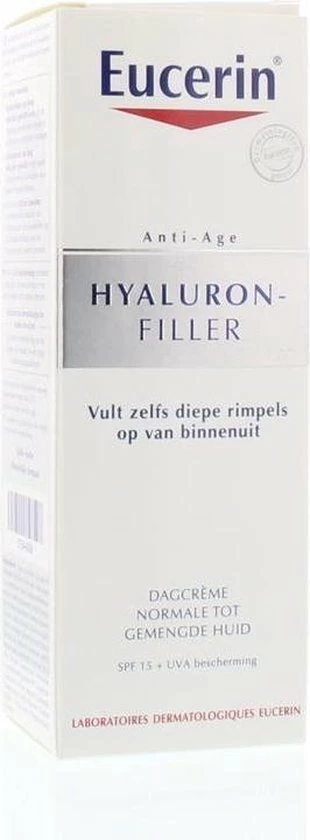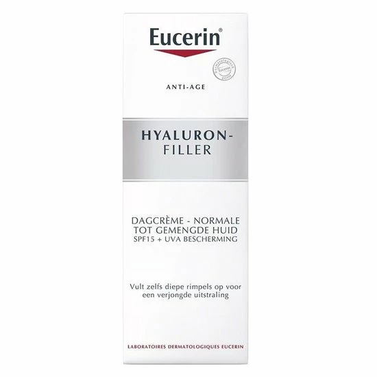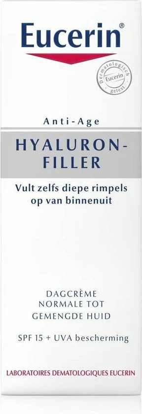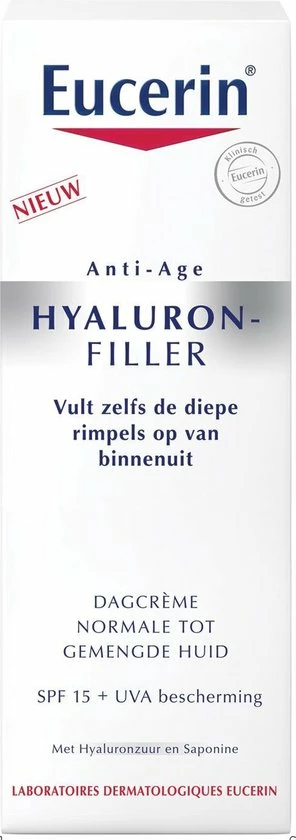 Eucerin Hyaluron-Filler Dagcreme vult zelfs de diepe rimpels van binnenuit op. Het is een anti-rimpel creme voor de normale tot gemengde huid met SPF15 + UVA-bescherming. De formule bevat 2 soorten moleculen van Hyaluronzuur om lachrimpels meer doelgericht van binnenuit op te vullen. Daarnaast bevat de formule Bio-actieve Saponine, dat de productie van hyaluronzuur ondersteunt. De SPF 15 en UVA-bescherming voorkomen op doeltreffende wijze voortijdige huidveroudering en verdieping van bestaande rimpels. Bij regelmatig gebruik van Eucerin Hyaluron-Filler Dagcreme wordt de huid gladder, terwijl lijntjes en rimpels zichtbaar verminderen. De dagcreme is een uitstekende basis voor make-up.