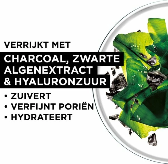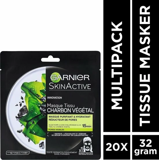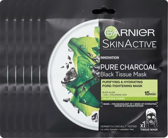 Garnier SkinActive Pure Charcoal Black Sheet Mask Zuiverend en Verfijnend Gezichtsmaskernn? Zuivert de huid in 15 minutenn? Hydrateert intensn? Verfijnt de pori?nn? Voordeelverpakking met 20 stuksnnDE VOORDELENnDit nieuwe zwarte Charcoal Sheet Masker van Garnier is ge?mpregneerd met houtskool, bekend om zijn uitstekende absorberende eigenschappen. De formule, verrijkt met Zwarte Algen extract, LHA en Hyaluronzuur, zuivert, verfijnt pori?n & de huidstructuur en hydrateert de huid. Geschikt voor een gevoelige huid.nnHET RESULTAAT nNa 15 minuten gebruik van het gezichtsmasker is het volgende resultaat bereikt:n? De huid ziet er gezuiverd uit*n? Het gezicht is gehydrateerd** n? De pori?n zijn zichtbaar verfijnd*nnNa 1 week:n? De huidstructuur is verfijnd en ziet er stralender uit***nn*Na 1 keer gebruikenn**Instrumentele test, 24 vrouwen & Consumenten test, 86 vrouwenn***Na 3 keer gebruiken per week nnHET GEBRUIKn1. Vouw het gezichtsmasker open. Breng aan op een schoon gezicht.n2. Laat het gezichtsmasker aansluiten met de gezichtsomtrek. Laat 15 minuten inwerken. n3 . Verwijder het masker. Masseer zachtjes in of gebruik een wattenschijfje om het overtollig product te verwijderen.nnINGREDI?NTENnAQUA/WATER, PROPLYLENE GLYCOL, GLYCERIN, PEG-32, PEG-40, HYDROGENATED, CASTOR OIL, PVM/MA COPOLYMER, PAPAIN, POTASSIUM HYDROXIDE, GLYCERYL, ACRYLATE/ACRYLIC ACID COPOLYMER, SODIUM, HYALURONATE, ANANAS SATIVUS FRUIT EXTRACT/PINEAPPLE FRUIT EXTRACT, P-ANISIC ACID, ALCOHOL, PROPANEDIOL, SUCROSE, HYDROGENATED STARCH HYDROLYSATE, HYDROXYACETOPHENONE, HYDROXYETHYLCELLULOSE, CAPRYLOL SALICYLIC ACID, CANTHAN GUM, FUCOS VESICULOSUS EXTRACT, SODIUM BENZOATE, PHENOXYETHANOL, PARFUM/FRANGRANCE (F.I.L. C208350/1).
