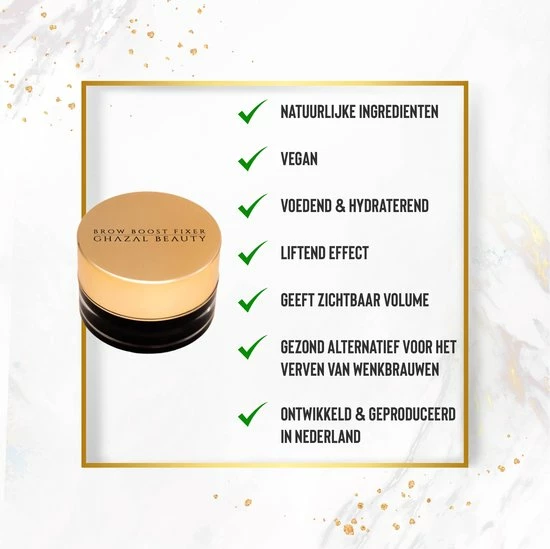 Geef je wenkbrauwen dat beetje extra met de Ghazal Beauty natuurlijke wenkbrauwgel. De wenkbrauw borstel en wax cre?ren een liftend effect, waardoor je gezicht er strakker uit ziet. Dankzij de natuurlijke ingredi?nten van de brow gel is deze vegan en cruelty free. De wenkbrauw gel heeft een voedende en hydraterende werking en beschermt bovendien tegen uv-straling. De brow gel is dan ook een gezond alternatief voor het verven van je wenkbrauwen. Ga vol vertrouwen met mooie wenkbrauwen de deur uit dankzij de Ghazal Beauty wenkbrauwgel!