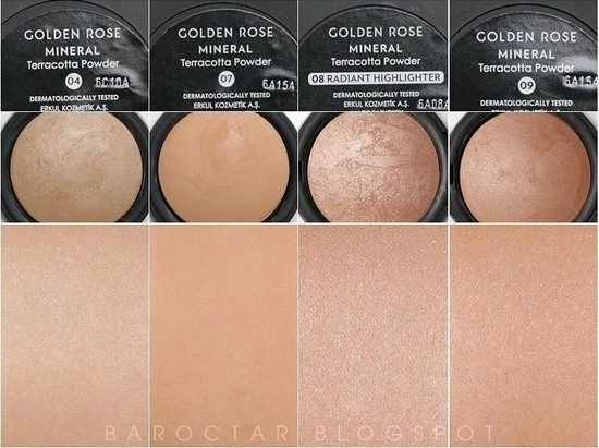 Golden Rose Mineral Terracotta Powder biedt een uitstekende dekking en zorgt voor een natuurlijke fluweelzachte afwerking.Kan direct, of in combinatie met een foundation worden aangebracht.NR. 08 en 09 zijn Highligters/shapers. De unieke samenstelling van de poeder bevat verschillende mineralen zoals, zinkoxide, mica, silica, kaolien en magnesium. Deze cre?ren een barri?re tussen de huid en schadelijke omgevingsfactoren om uw huid te beschermen.