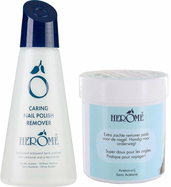 Veel removers zijn agressief en verslechten de conditie van je nagels. Deze agressieve en vaak goedkope removers doen de rest van de verzorging van de nagels te niet. Doordat deze removers onder andere vocht uit je nagels onttrekken is bijvoorbeeld de kans op splijtende nagels vele malen groter. Met de Herome Caring Nail Polish Remover cre?er je snel diep gereinigde nagels op milde wijze! De toegevoegde Lanoline voorkomt uitdroging en geeft de nagels een mooie glans. De Herome Caring Nail Polish Remover is effectief en de geur is bijzonder aangenaam. De Herome Caring Nail Polish Remover is acetonvrij, waardoor uw nagels niet uitdrogen.