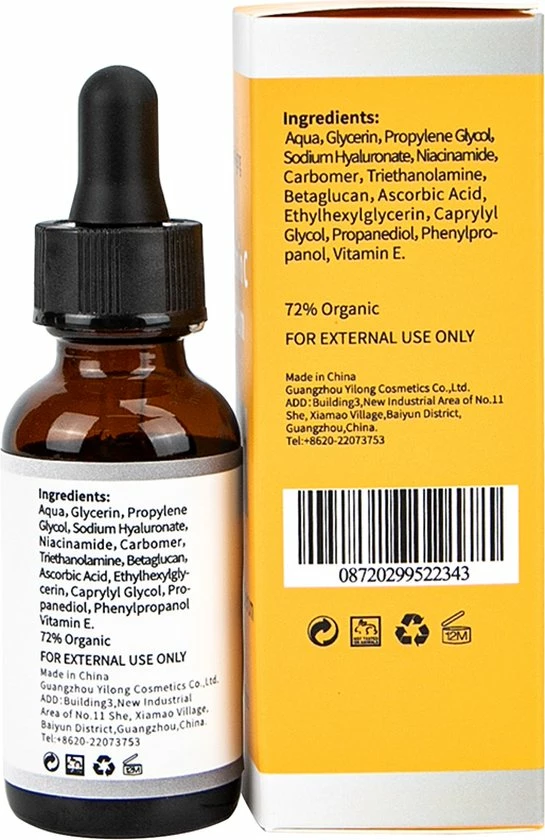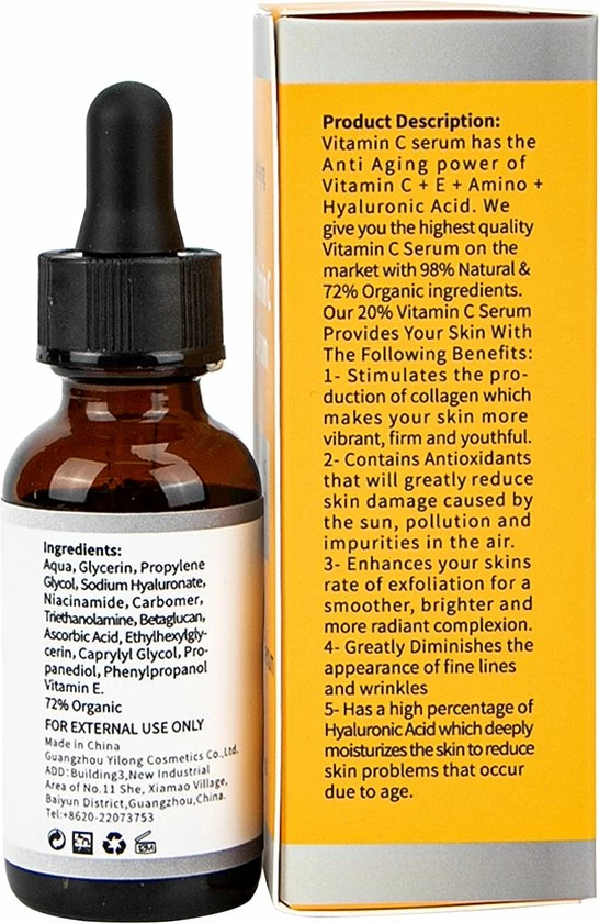 Ons Vitamine C 20% serum voor een herleven, strakkere en gladdere huid en bekend om zijn natuurlijke anti rimpel- en anti-verouderings oplossing. Vitamine C-serum heeft een geavanceerde, stralende formule + anti-ging gezichtskenmerken voor een mooie zachte en soepele huid. De natuurlijke extractie van Vitamine C is een noodzakelijk element van collageen fusie. Versnelt de aanmaak van collageen, herstelt de verbinding tussen cellen en verbetert de huidelasticiteit en fitheid van de huid. Met een hoger Vitamine C-gehalte zal het anti-aging reparatie-effect verdubbelen