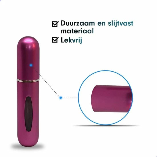 Bekijk de parfumverstuiver niet alleen als handig beautyproduct maar ook als modeaccessoire. Bij MaxedMore is de verstuiver in wel meer dan 10 verschillende kleuren te krijgen, zo kan je in elke tas een bijpassend flesje hebben. Parfum maakt je outfit pas echt af!