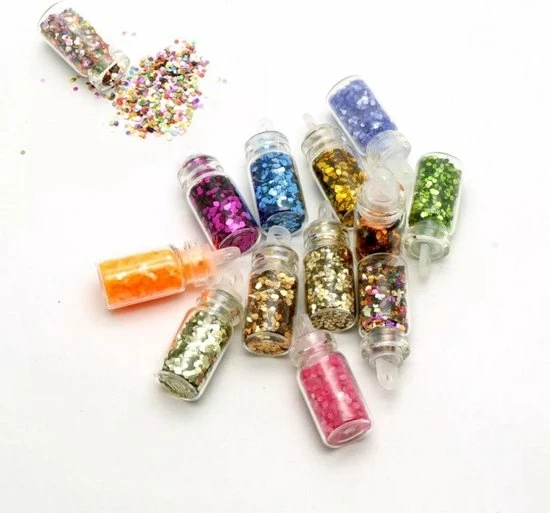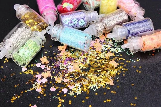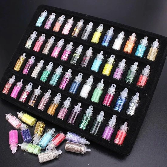 Style je nagels op alle mogelijke manieren! 48 potjes met verschillende soorten decoratieve elementen om je nagels mee te stylen, waaronder glitters.