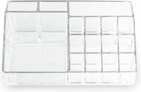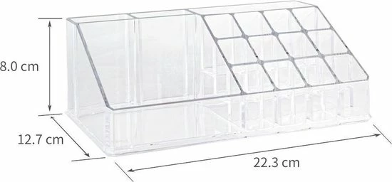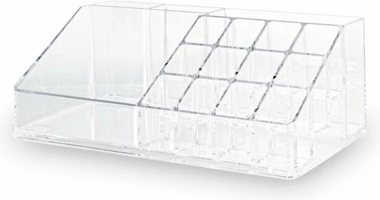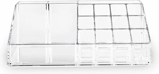Dit is een compact make up organizer. Daarom kan je hem vrijwel overal neerzetten zonder dat hij in de weg staat. Ondanks dat hij compact is, heeft hij 16 vakjes en daarmee biedt hij meer dan voldoende ruimte!