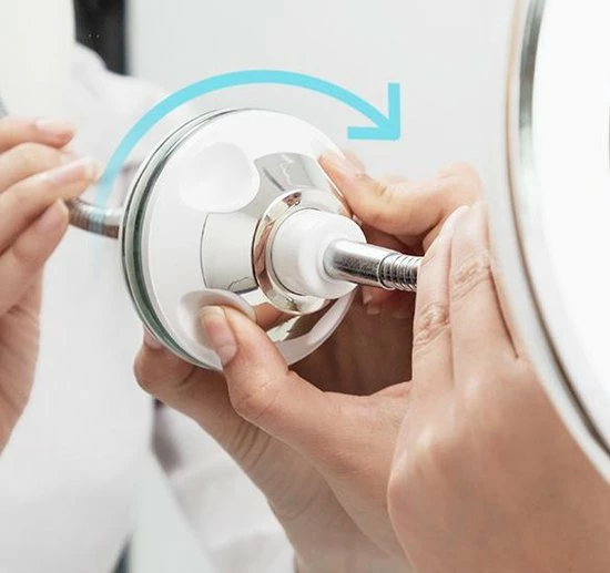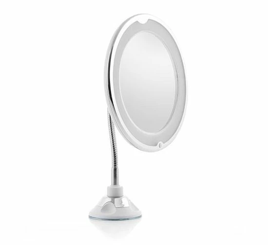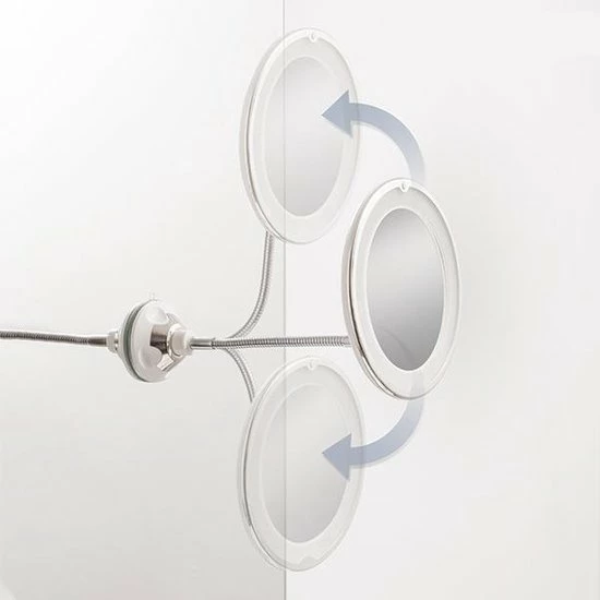 De spiegel voorzien is van wit LED licht en heeft een flexibele arm zodat u hem op de juiste hoogte kunt plaatsen.Door het kogelgewricht is deze spiegel volledig 360 graden draaibaar.De LED verlichting werkt op 3 batterijen (AAA) maar deze zijn niet inbegrepen in de doos.