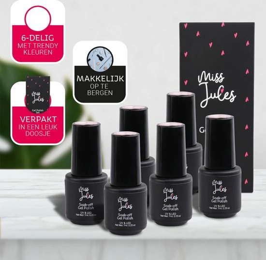 Met deze 6-delige gel nagellak set van Miss Jules heb je keuze uit 6 trendy kleuren voor elke gelegenheid. Deze gellak kan zowel op een natuurlijke nagel als op een kunstnagel worden aangebracht.