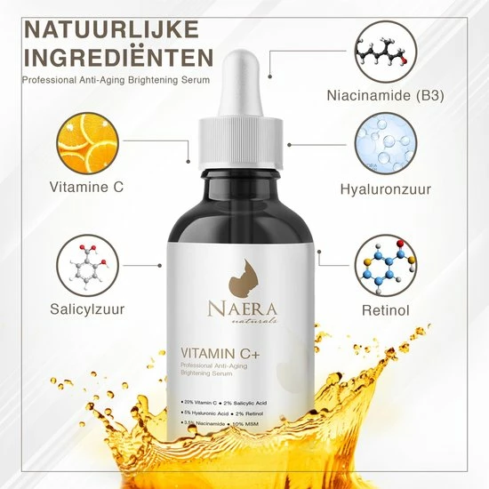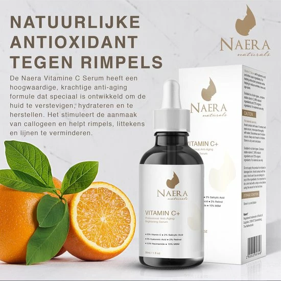Mooie jij, betoverde zij met het Naera Vitamine C serum! In combinatie met Vitamine E de perfecte antioxidanten formule. Beschermt tegen acne, vervuiling, littekens, pigmentatie, hydrateert en geneest door middel van glycerine, lubrajel CG en citroenzuur. Geschikt voor de gevoelige huid door het hyaluronzuur. En bevat tot wel 30% vitamine C. Met hygi?nische doseerpipet voor een zuinig gebruik. Vandaag is de dag om iets voor jezelf te doen en dat doe je pas echt goed met producten van Naera!