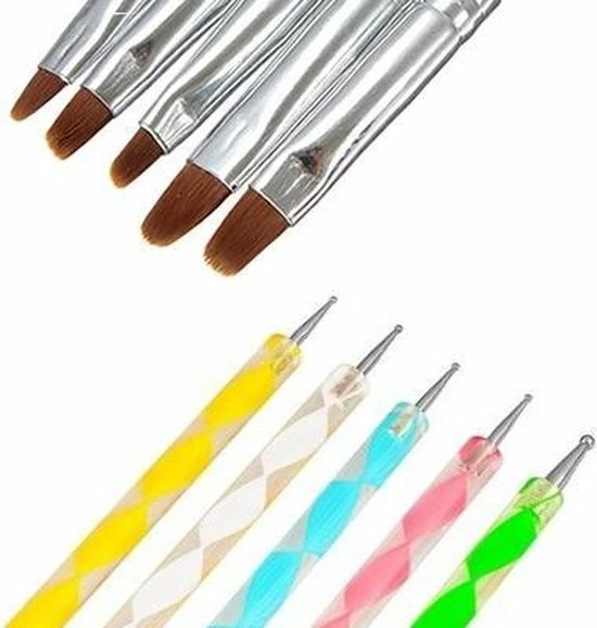 Deze Acryl Penselen set bestaat uit 5 penselen met aan de andere zijde een druppelpen. Met deze combinatie maak je de mooiste nail art!