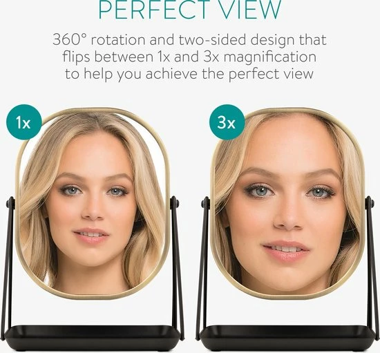 - 360° DRAAIBAAR: De opmaakspiegel is 360 graden draaibaar en heeft aan beide kanten een spiegel. De ene kant is zonder vergroting en de andere kant vergroot maar liefst drie keer.