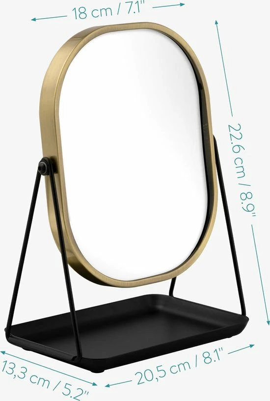 - DETAILS: De spiegel is gemaakt van stevig glas met zwart metalen frame en gouden rand. Hij is 20,5 x 13,3 x 28 cm groot. Let op: de siegel heeft geen LED-verlichting.