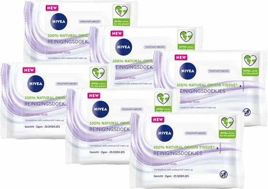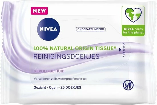 NIVEA Reinigingsdoekjes voor de gevoelige huid verrijkt met dexpanthenol. Verwijderen effectief waterproof make-up en mascara, zodat je huid zacht en gehydrateerd aanvoelt. De ongeparfumeerde en alcoholvrije formule is zeer geschikt voor de gevoelige huid. Huidvriendelijkheid dermatologisch en oftalmologisch goedgekeurd. Reinigingsdoekjes van natuurlijke oorsprong*. *Ingredi?nten afkomstig uit de natuur die na verwerking meer dan 50% van hun natuurlijke staat behouden, inclusief water.