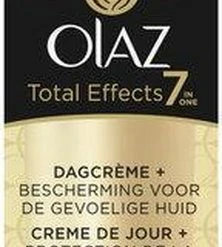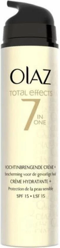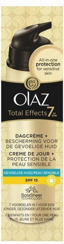 Olaz Total Effects 7-in-1 Gevoelige bescherming is een veelzijdige dagcrème die speciaal is ontwikkeld voor de gevoelige huid. Bevat super huidvitaminecomplex VitaniacinTM met vitamine B3, E en C en stimuleert het natuurlijke vernieuwingsproces van de huid door het huidoppervlak zachtjes te scrubben. Hierdoor gaat de huid er gezonder uitzien. Deze crème bevat super anti-oxidanten en werkt hydraterend, om de vochtbalans van de huid te versterken. Zo gaat je huid er jonger uitzien en is hij beter beschermd tegen schadelijke omgevingsfactoren binnen en buiten, zoals airconditioning, verwarming en uv-licht. De SolaSheerTM-technologie met een breed spectrum UVA/UVB-filter met SPF15 vormt een verzorgende bescherming bij geringe dagelijkse blootstelling aan UV-straling. Deze dagcrème bestrijdt 7 tekenen van het ouder worden: helpt de zichtbaarheid van fijne lijntjes en rimpels verminderen, helpt roodheid zichtbaar te verminderen, hydrateert voor een steviger uitziende huid, verzorgt, maakt de huidtint egaler, verzacht en egaliseert de huidstructuur, geeft de huid een gezonde gloed. Het is Olaz’ simpele, slimme aanpak voor een jongere, beter beschermde, gezonder uitziende huid voor het leven.