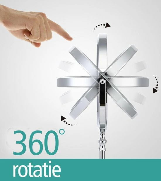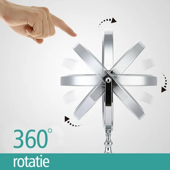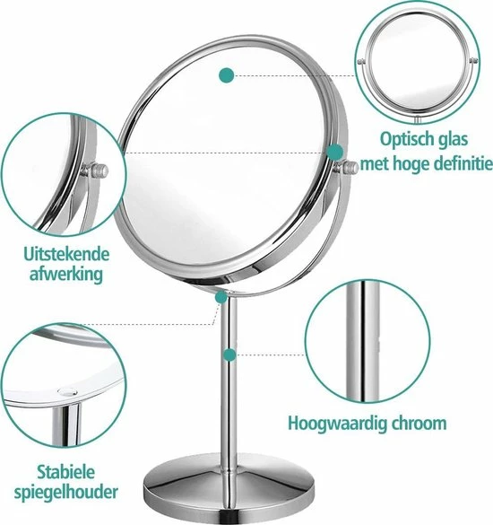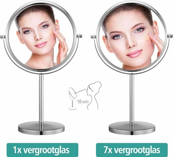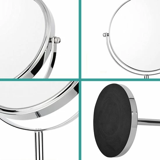 De Make-up Spiegel beschikt ook over een 7 maal vergrotende kant zodat u alle details extra goed kunt zien. U kunt de Make-up Spiegel helemaal roteren zodat u makkelijk kunt switchen tussen de normale en vergrotende kant. De Make-up spiegel is gemaakt van hoogwaardige kwaliteit metaal waardoor deze niet snel zal krassen, slijten of roesten, ook de levensduur word hierdoor aanzienlijk verlengd. Het mooie chromen uiterlijk zorgt ervoor dat dit product strak, hip en tijdloos is waardoor deze overal mooi tot zijn recht zal komen. De onderkant is voorzien van schuimrubber wat zorgt voor extra grip en voorkomt krassen op bijvoorbeeld uw badkamer meubel, tafel of kast.
