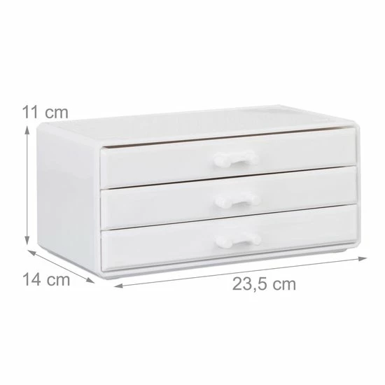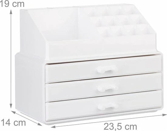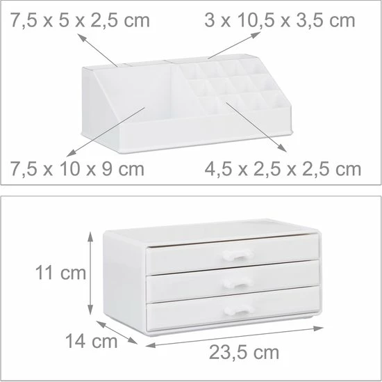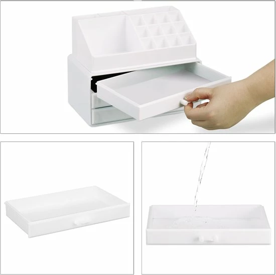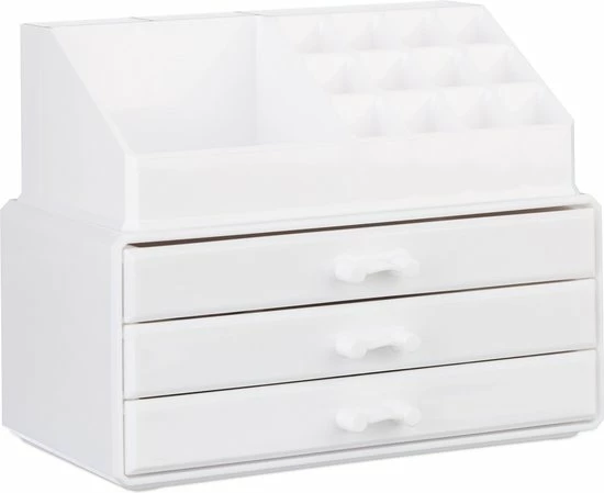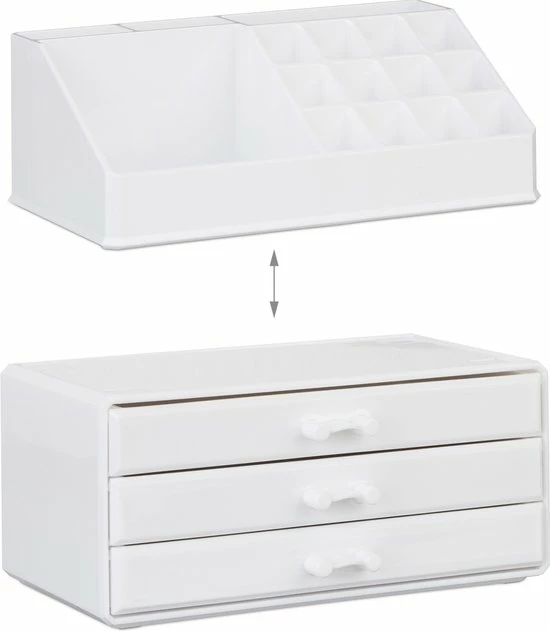 De kleine make-up organizer cre?ert ruimte op de kaptafel en bespaart je het zoeken in je toilettas. De tweedelige make-up standaard biedt met in totaal 19 vakjes veel opslagruimte voor cosmetica en sieraden. De lades zijn geschikt voor cr?mes, poeder en oogschaduw, alsook voor horloges, kettingen en armbanden. De praktische houder voor lippenstift is ook geschikt voor nagellak, borstels, stiften en nog veel meer. De houder doet het ook zeker goed als bureau-organizer voor kantoorartikelen of als opbergruimte voor schroeven en ander klein gereedschap.