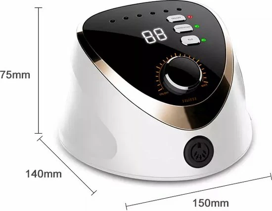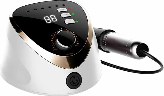 Op de nagelfrees zit een LED-scherm waarop je kunt zien wat je rotatie snelheid van de frees is. Het voetpedaal dat wordt meegeleverd, biedt een comfortabele bediening. Je kunt de nagelfrees namelijk zo instellen dat jij de snelheid bepaalt met het pedaal. Hierdoor heb je continu beide handen vrij om zo secuur en snel mogelijk te werk te gaan. Het pedaal is voorzien van een anti-slippad, deze beschermt tegen uitglijden en ongewenste handelingen. Er zit een standaard in de set waarop je de handfrees neer kunt leggen zonder dat deze beschadigt, om hierna de behandeling veilig te kunnen vervolgen. Bovenop de nagelfrees zitten 6 gaatjes, hier kun je favoriete, meest gebruikte nagelfrees opzetstukken in plaatsen en wisselen wanneer gewenst. Met de bijgeleverde opzetfrezen kun je hybride nagelproducten verwijderen, nagelriemen bijwerken en verwijderen, de nagels reinigen, matteren, inkorten en gladmaken.