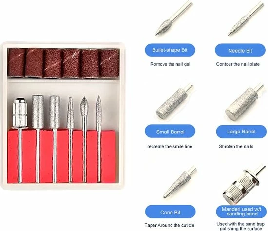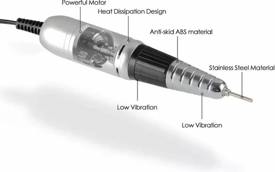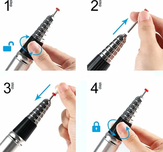 De nagelfreesmachine heeft een diameter van 2.32mm, alle standaard opzetfrezen met een Twist&Lock systeem passen op de nagelfrees.