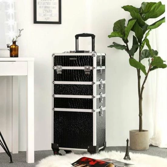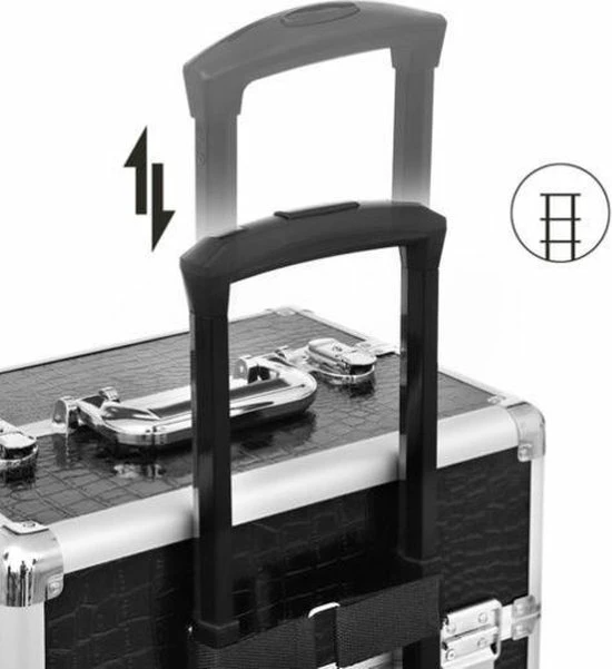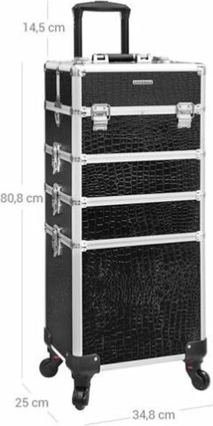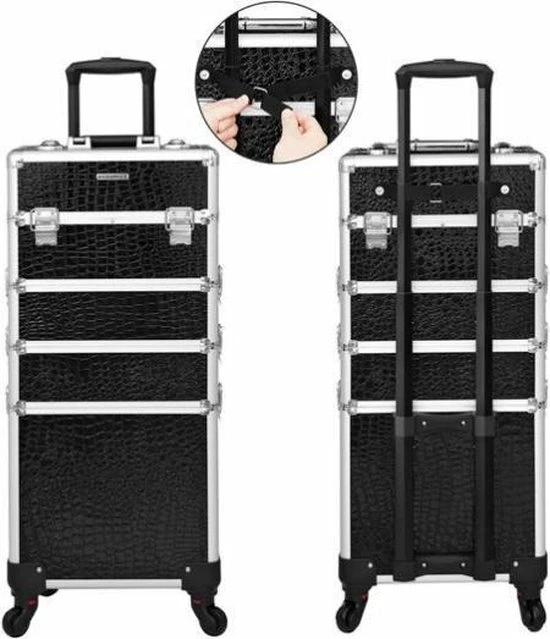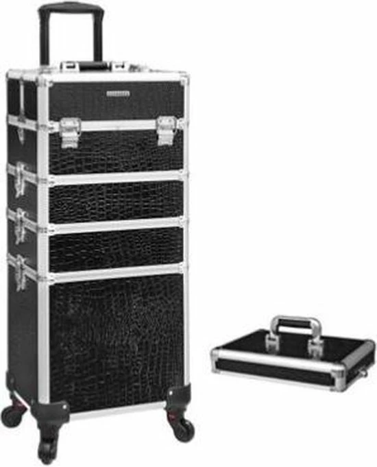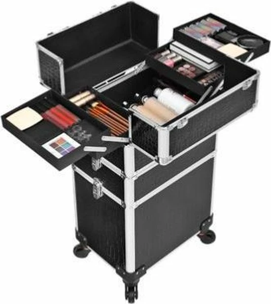 Ruim en goed verdeeld – in totaal 4 niveaus: 1. een juwelenkistje; 2. een uitneembaar compartiment; 3. een vak met tussenschot van EVA-kunststof; 4. een grote doos met een telescopisch handvat. Alles is netjes en binnen handbereik opgeborgen.