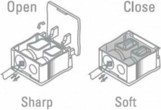 Met deze multifunctionele slijper kunt u kiezen tussen een scherpe of een ronde potloodpunt. Als u het plastic klepje opent, krijgt u een scherpe potloodpunt. Als u het plastic klepje sluit, krijgt u een afgeronde potloodpunt. Het bakje vangt alle vijlsels op. Perfect voor elke make-upartiest!
