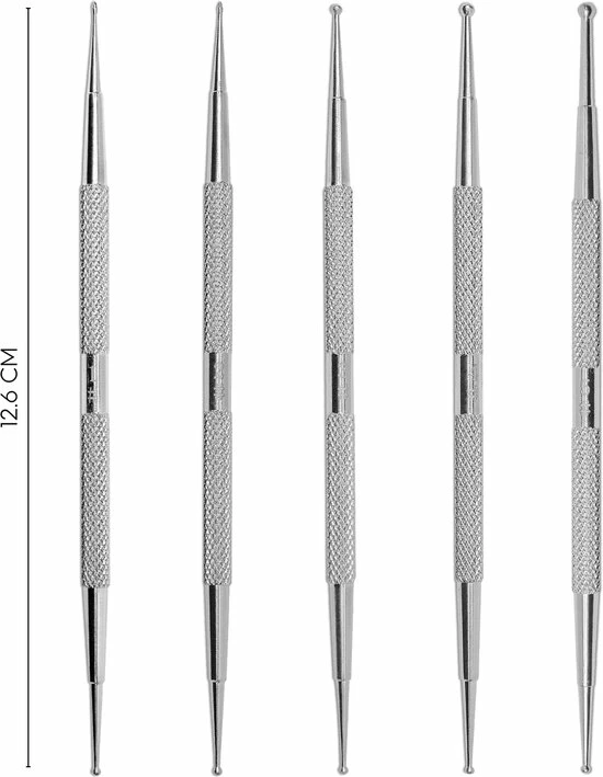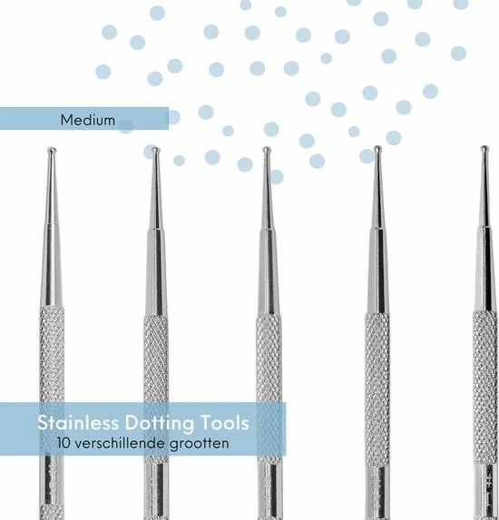 Onze YUBBI stainless dotting tool set bestaat uit 5 dubbelzijdige penselen. Hiermee wordt je voorzien van 10 verschillende maten dotting tools voor al je creaties.